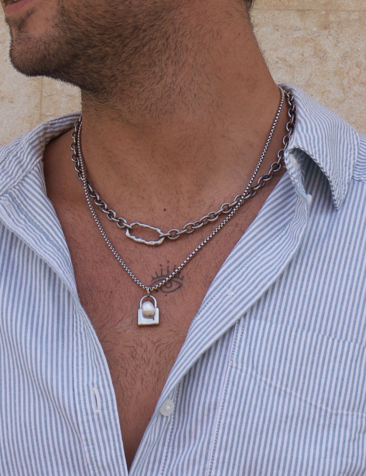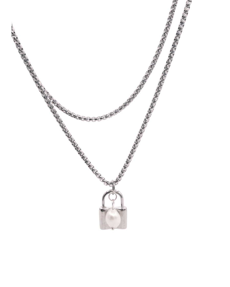 Cadena de acero inoxidable con charm de acero inoxidable y perla natural.